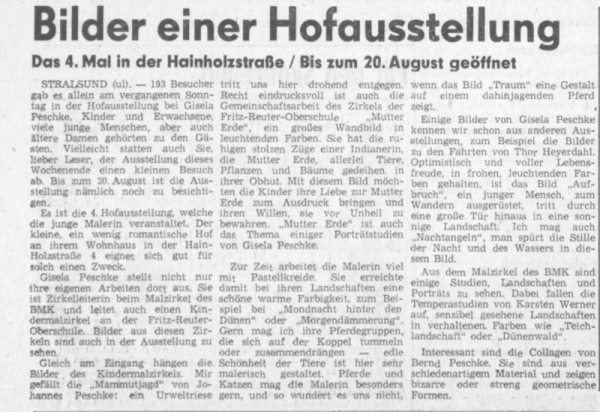 Stralsund: 193 Besucher gab es allein am vergangen Sontag in der Hofausstellung bei Gisela Peschke. Kinder und Erwachsene, viele junge Menschen, aber auch ältere Damen gehören zu den Gästen. Vielleicht statten auch Sie, lieber Leser, der Ausstellung dieses Wochenende einen kleinen Besuch ab. Bis zum 20.August [1979] ist die Ausstellung nähmlich noch zu besichtigen.